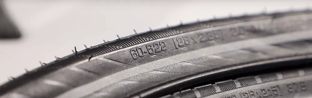 Controleer de bandbreedte op de band zelf. De eerste twee cijfers geven de breedte aan, op onderstaande foto is dat 60 mm. Meet de spatbordbreedte als deze breder is dan de band. De totale breedte van band en spatborden mag bij het Pro Amparo 4750 SL R Ringslot niet meer dan 74 mm bedragen.