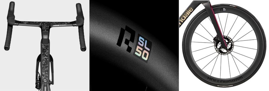 Bij een nieuwe fiets horen ook nieuwe wielen. Bij Cannondale zijn ze terug naar de tekentafel gegaan en komen met de Hollowgram R-SL 50 wielset. De 50 staat voor de 50 cm hoogte van de carbon velg. Platte spaken verbinden de DT-Swiss 240 naaf met deze aerodynamische velgen. Kortom een allround wielset van de bovenste plank.