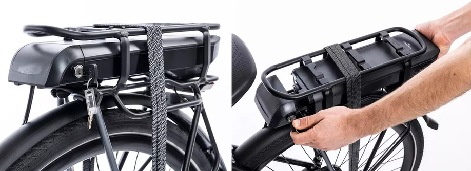 De afbeelding laat zien hoe je een drager accu ut de bagagedrager verwijdert