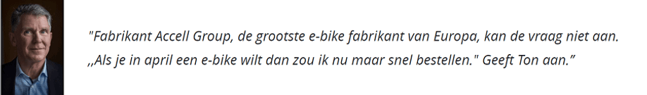 NU.nl 14 juni 2020 - "De levertijden lopen op, de beschikbaarheid begint een probleem te worden." CEO Accell.