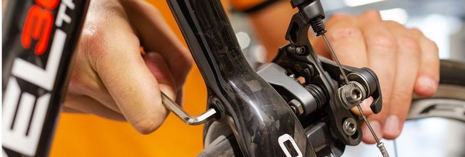 7. Stel de remblokken af. Knijp de remhendel in en controleer of de remblokken op het midden van de velg zijn gepositioneerd. Wanneer dit niet het geval is kun je de remblokken losdraaien, verplaatsen en vervolgens weer vastdraaien met behulp van een inbussleutel