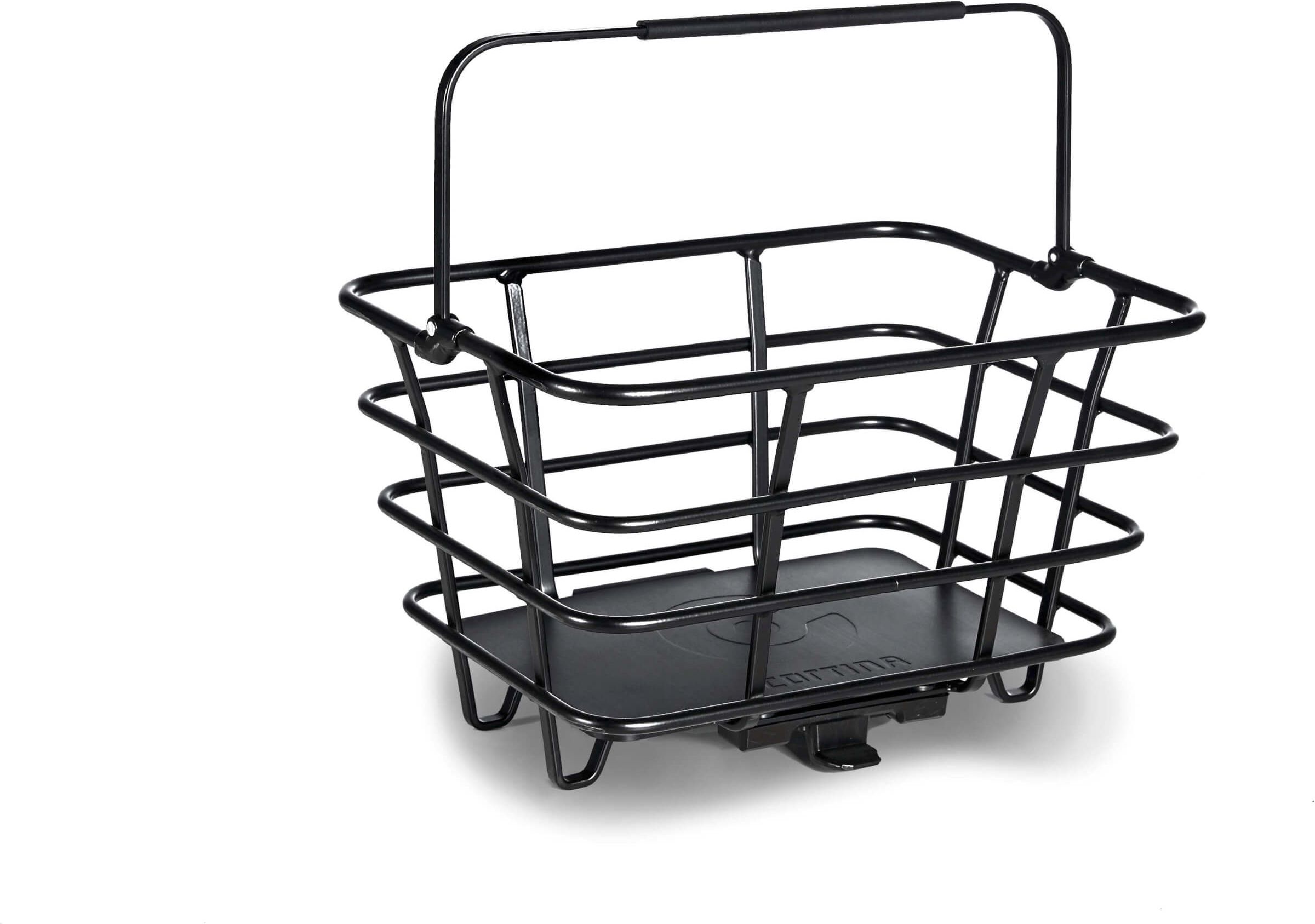 Super handig mandje waar werktas inpast maar ook veel boodschappen. En makkelijk eraf te halen om mee te nemen naar binnen.
