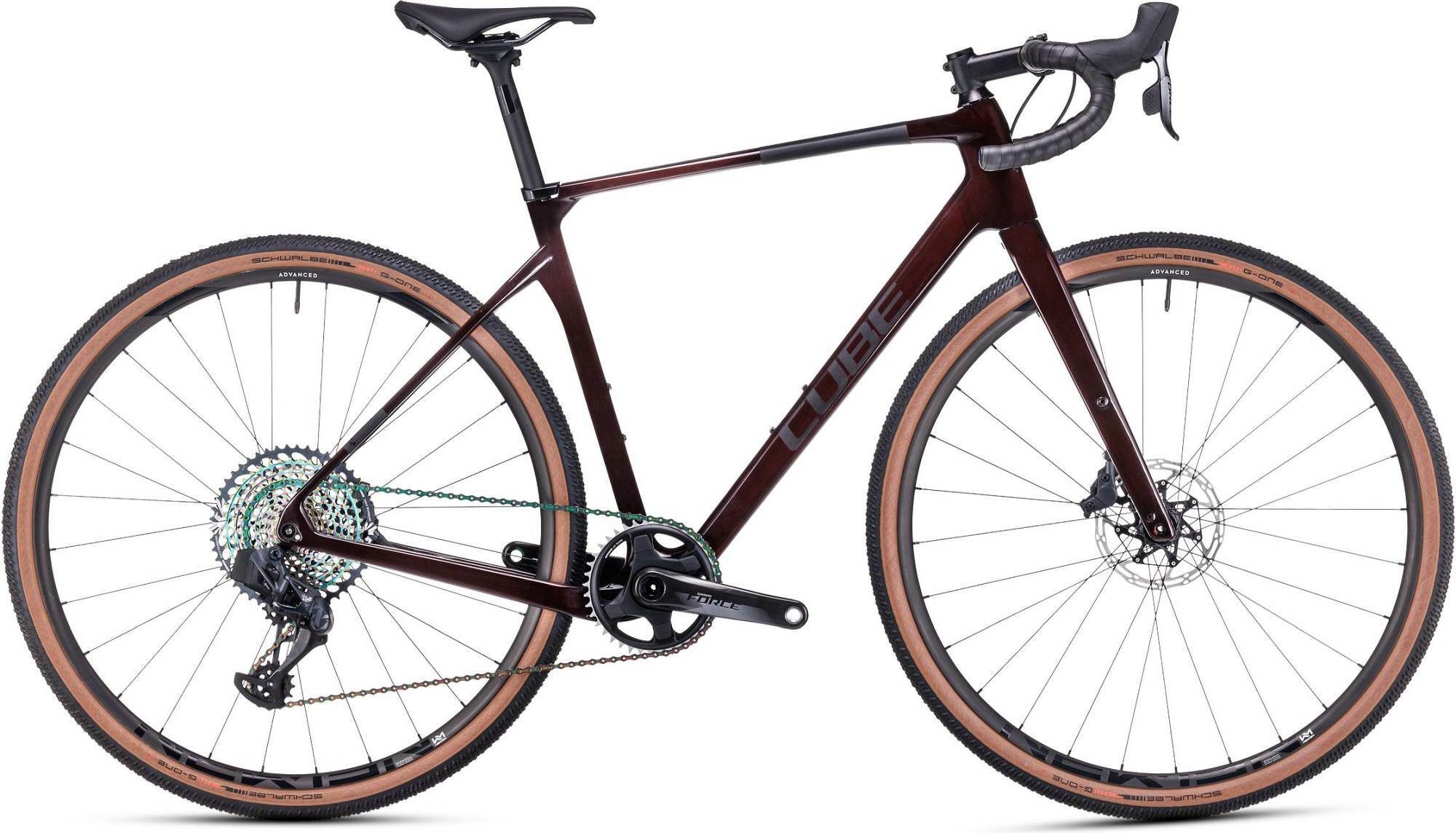 De fiets is afgemonteerd met de draadloze Sram Force XPLR eTap AXS 1x12-aandrijflijn met 10-44T cassette. Deze grote cassette springt meteen in het oog en dat mag ook wel. Met deze groepset beschik je over een soepel schakelvermogen en groot schakelbereik voor zowel sprints op de weg als op steile, onverharde beklimmingen. Tevens is deze groepset extra stijf, waardoor schakelen soepel en direct gaat.