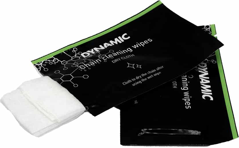 Met de Dynamic Bike Care Chain Cleaning Wipes kun je onderweg gemakkelijk je ketting schoonmaken. De verpakking bestaat uit twee verschillende doekjes: een natte doek en een droge doek. Het natte doekje is voorzien van de Dynamic Bike Care Chain Cleaner, die olie en vuil gemakkelijk oplost. Met de droge doek kun je overtollige olie gemakkelijk wegvegen. De Chain Cleaning Wipes zijn gemakkelijk onderweg mee te nemen, bijvoorbeeld tijdens het bikepacken of op vakantie!