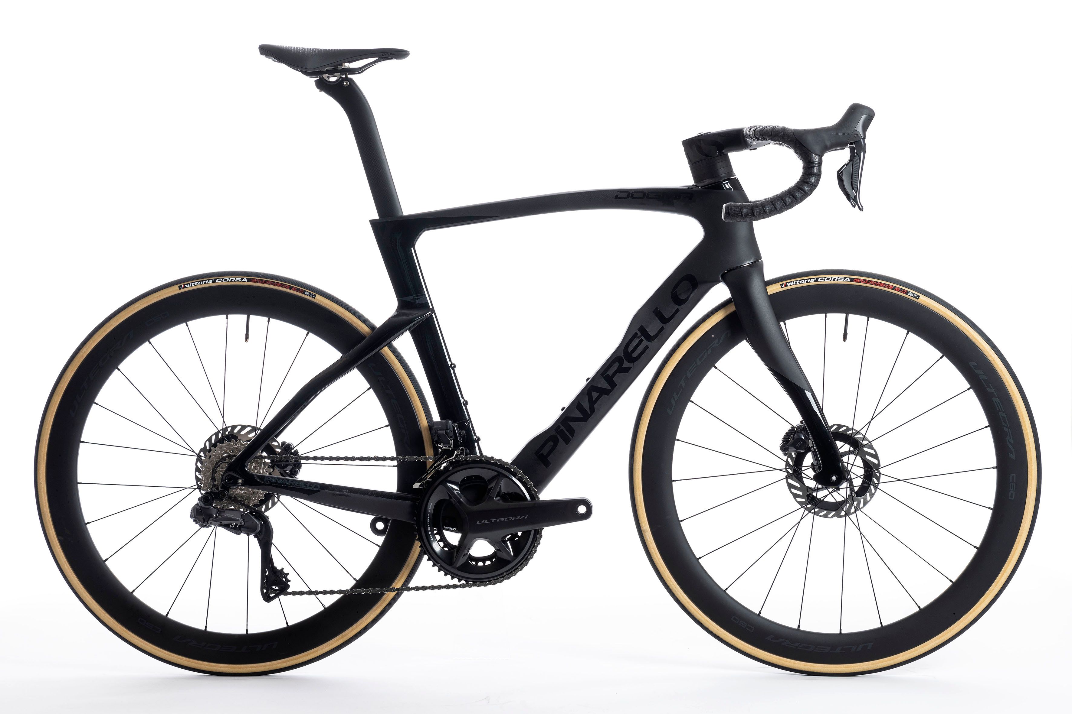 Lichte carbon wielen kunnen natuurlijk niet ontbreken. De Pinarello Dogma F Disc Ultegra is voorzien van Shimano Ultegra R8170 C60 carbon wielen. Deze tubeless ready wielen hebben een velghoogte van 60 mm en zijn daardoor niet alleen aerodynamisch maar ook nog eens een lust voor het oog. Gecombineerd met de Vittoria Corsa Graphene G2 banden kun je elke scherpe bocht aanvallen. Wacht niet langer en verbreek al je persoonlijke records met de snelle Dogma F van Pinarello!