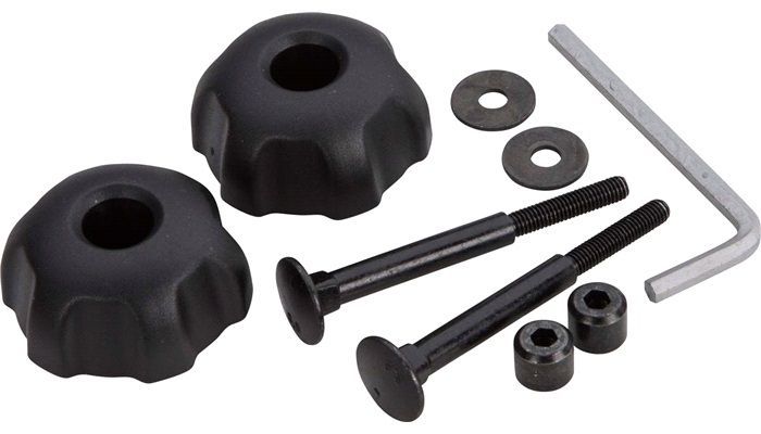 Originele Thule Sparepart 52587 Draaiknop voor de VeloCompact fietsendrager. De verpakking bevat twee draaiknoppen voor op de bevestigingsarmen, moeren, bouten en een inbussleutel. Met de montageset heb je direct alles in huis.